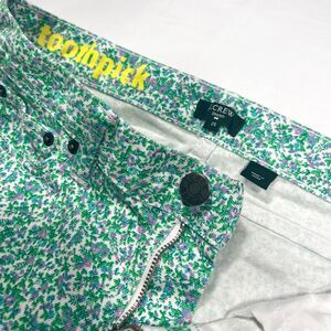 J.Crew "Toothpick" skinny jeans in a multicolored floral print. These jeans are made with a stretch fabric and have a zip fly and button closure. J.Crew's Toothpick jeans are known for their comfortable fit and flattering silhouette. Snug fit, similar to leggings, with the hemline at or slightly above the ankle.