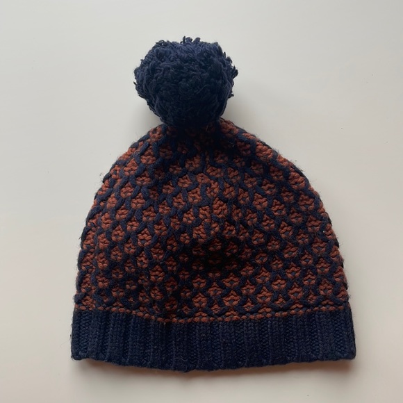 Blue and orange hat from JCrew. 37% viscose, 33% nylon, 25% lambs wool, 5% cashmere