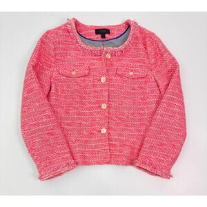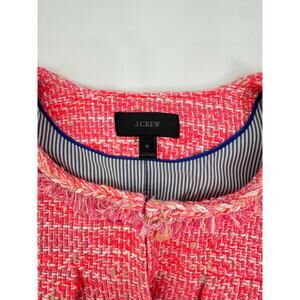 Chic and feminine J.Crew hot pink tweed blazer in size 12. Features textured tweed fabric, fringe trim along the neckline and cuffs, button front closure, and slight peplum hem for a flattering silhouette. Fully lined with striped interior for added structure and comfort. A beautiful statement piece perfect for work, brunch, or layering.