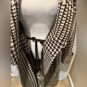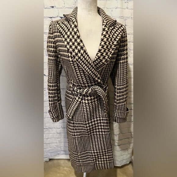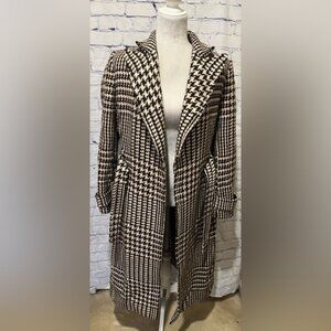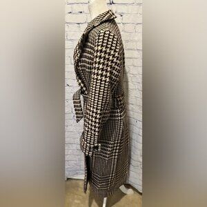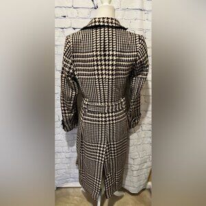 This J.Crew trench coat is a stylish winter and fall outerwear option for women. Made from a wool blend in a classic brown and cream houndstooth pattern, this long coat features long sleeves and a tie closure. The size 6 coat is designed with a wool blend, emphasizing both warmth and style. Perfect for adding a touch of sophistication to any outfit, this coat is a versatile addition to any wardrobe. 19 inches pit to pit and 45 inches long. Smoke free home.