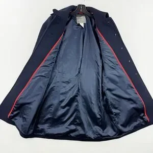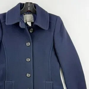 A sophisticated and timeless J.Crew coat, perfect for adding a touch of elegance to any outfit. This navy blue coat features a classic silhouette with a button-front closure, notched collar, and functional pockets. The design is completed with a back vent and buttoned cuff details.