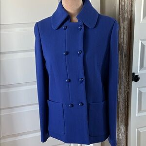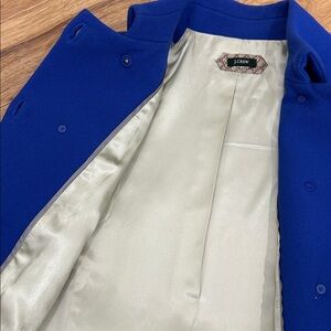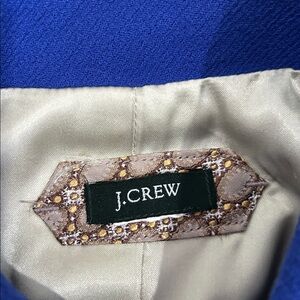 J Crew Jacket. Vintage. Black label. Size tag out. Measuring 8/M I’m a 6 and she fits me nicely. Elegant, classic royal blue double-breasted jacket. Full lined. Knit weave. Cute back detail. Original buttons. She does Not have Wool in her!. Perfect fall, winter, spring. She’s in excellent condition. Closet staple. Only call out is missing size and material tag.