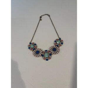 This enchanting necklace tells a story of elegance and charm, featuring vivid blue and pink stones alongside mint-green gems, all set on a vintage-inspired gold-tone chain. A statement piece for those who adore unique, artistic designs.