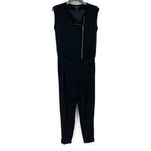 J.Crew Jumpsuit Womens Size 0 Black Sleeveless Asymmetrical Zip Front Skinny. Good pre-owned condition, few bleach spots on front leg (see photos).