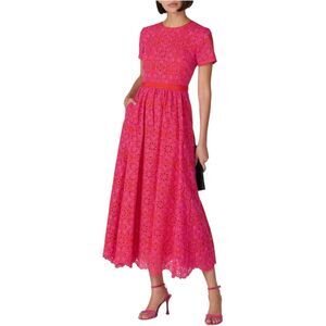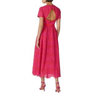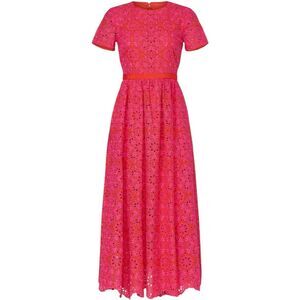 Pink laced cotton (60% Polyester, 40% Cotton). Hourglass. Short sleeves. Crew neckline. Exposed back zipper closure. Fully lined. Side pockets. 56" from shoulder to hemline. Imported.