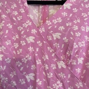 Adorable dress. Feminine style with floral pattern and ruffles at hem. Hem line gets higher in the front. V-neck with hook to close. Elastic at waist in back.