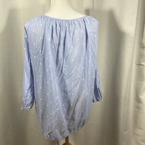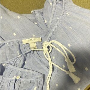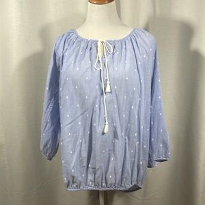 Light blue blouse with tassel ties. Features subtle white dot pattern. Perfect for casual wear.
