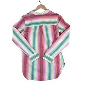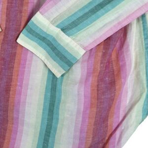 This J.Crew shirt brings vibrant, easygoing charm to your wardrobe. Featuring vertical rainbow stripes in muted sorbet tones, this lightweight button-up blends a breathable linen-cotton fabric with relaxed tailoring. Long sleeves, a curved shirttail hem, and a flattering v-neck collarless design offer a versatile silhouette perfect for layering or wearing solo. Size 2.