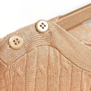 Lightweight sweater from J.Crew, made from breathable 100% linen. Features classic cable knit detailing, flattering boatneck with button accents on both sides, and 3/4 sleeves.