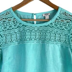 Features: crewneck, 100% cotton lace short sleeves, lace upper bodice, 100% linen main shirt, keyhole back with button closure. Color: mint green.
