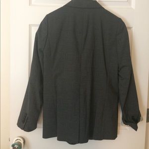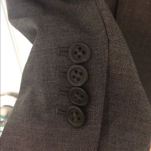 Light wear overall. Second photo is stock photo. Item is actually heather carbon color GY6397. Sleeves are lined with stripe fabric. 98% wool, 4% spandex. Lining 100% polyester. Dry clean