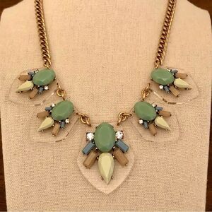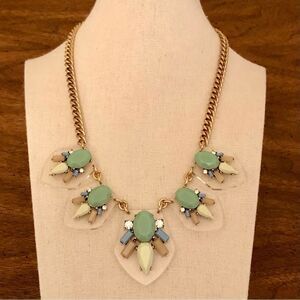 Clear Lucite Pendants with Mint Colored, Blue and Neutral Resin Stones and Rhinestone Accents. Antique Brass Tone, Flat Cuban Chain. Unique Statement Piece!