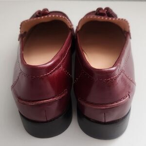 These J. Crew loafers showcase a polished leather upper in a rich burgundy shade, complete with decorative tassels for added flair. The sleek design and low-profile silhouette make them perfect for formal occasions, while the glossy finish enhances their sophisticated appeal.