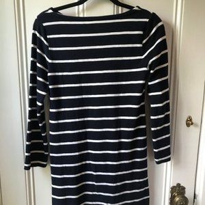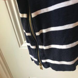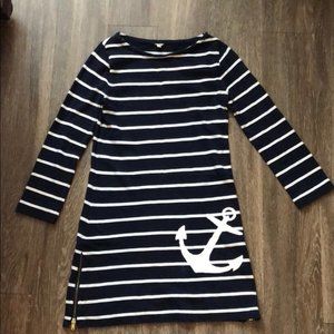 Perfect nautical vacation dress. Cape Cod, Nantucket, and Martha’s Vineyard vibes!! Also great for staying at a cabin on the lake and needing a dress for the cooler weather or in the evenings. Perfect with straw hat or fedora. Cute anchor detail on bottom right of the dress. Size small. 7" Zippers up the sides from the bottom. 32" long. 100% cotton. Item 83375. Very good used condition. I am selling it because I realized that I have gone overboard (ha ha) with the nautical stripes for summer.