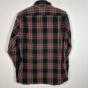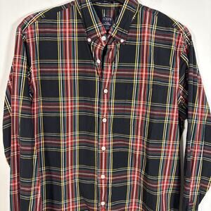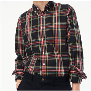 The J.Crew Men's Shirt in LT Tall size is a classic and versatile addition to any man's wardrobe. This black and red tartan plaid shirt features a collared neckline, long sleeves, and a button-up closure. Made from lightweight cotton fabric with a woven texture, this shirt is perfect for all seasons and occasions, from casual outings to workwear and even parties. The colorful accents and tall fit make it a stylish and comfortable choice for the modern man.