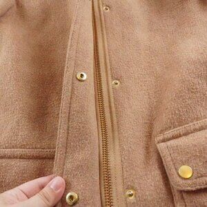 Stylish J. Crew coat in tan. Features a cozy hood with faux fur trim. Front pockets with button details.