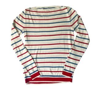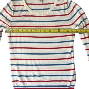 This is a women’s J.Crew Mercantile sweater in size XXS. It is made of 100% cotton and features a classic crewneck design with long sleeves. The sweater has a white background with horizontal red and blue stripes, giving it a timeless and versatile look.