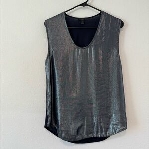 Sleeveless tank top blouse, curved hem, scoop neck, two tone, navy blue with metallic front, silk blend, some stretch. Lightweight. Great for going out, layering for the office, academia, eras tour, etc.