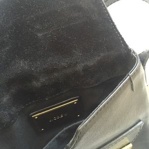 Such an elegant black bag. The gold bar is the magnetic clasp to keep the bag shut. Perfect for a nice event, dinner, or simply a casual walk. Fits everything you need: phone, some makeup, keys, crest cards, and cash. Adjustable shoulder strap fully extends to 24" shoulder drop.