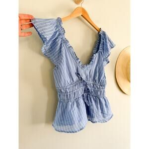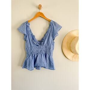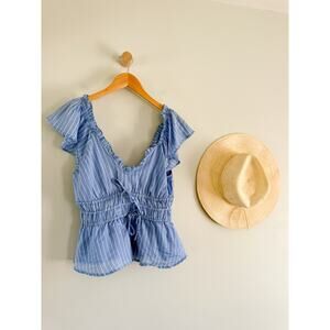 J.Crew top, Palermo blouse, blue striped top, ramie fabric, flutter sleeve blouse, peplum style top, tie waist blouse, feminine chic, summer blouse, coastal style, lightweight fabric, casual chic, timeless staple, effortless style, Parisian inspired
