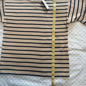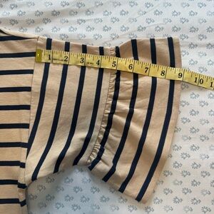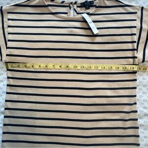 J. Crew striped top. Featuring a stylish tan and navy design, this top is perfect for any occasion. Enjoy comfort and style in one piece. Relaxed fit.