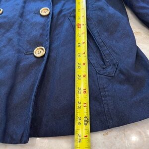 This is a navy pea coat from J.Crew in size 6. It’s made from a sturdy cotton canvas (about 95%) with a subtle sparkle in the weave that gives it a nice texture. Classic double-breasted front, side pockets, and that clean J.Crew silhouette. It’s in excellent preowned condition with minimal signs of wear. The fabric is a little wrinkly from storage, but it’ll look great - crisp and preppy - once it’s pressed.