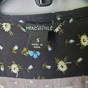 J.Crew Mercantile floral print wrap dress in navy with light blue and ivory flowers. Features a flattering wrap silhouette with side tie closure and short sleeves. Midi length.