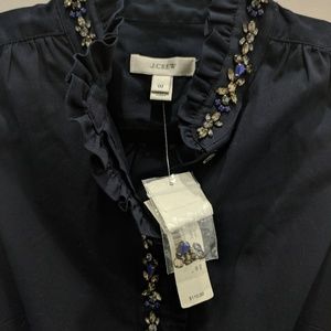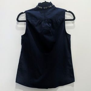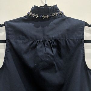 Hand-placed clusters of faceted stones ring the collar and trim the placket of this crisp oxford shell. Layered with a cardigan, it's our new take on the fancy twinset.
