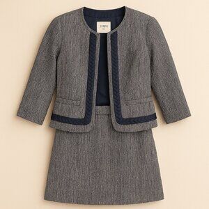 Elevate your workwear with this timeless J.Crew navy tweed skirt suit set. Crafted from a luxe cotton blend, this tailored pairing features a chic collarless jacket with braided trim detail and a matching A-line skirt for a sophisticated, polished look. Perfect for office, business meetings, or formal occasions.