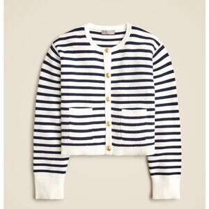 J.Crew New Relaxed Emilie Sweater Jacket Women’s Size Medium – Item CB889, White and Navy Striped Colorway, Open-Front Design, Gold Crest Button, Crewneck, Front Patch Pockets, Cropped Fit, Long Sleeves, Soft Cotton Knit Construction, Polished Sweater-Jacket Hybrid Style, Midweight and Comfortable, Clean and Modern Silhouette, Perfect for Layering at the Office, Casual Outings, or Travel.