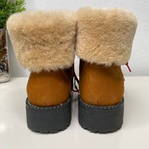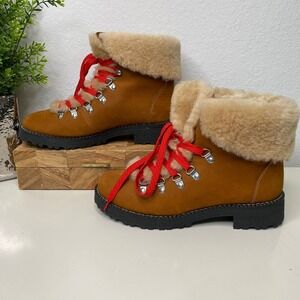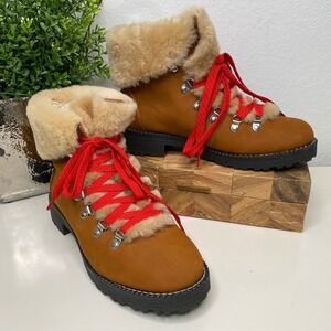 J.Crew Nordic Ankle Boots Fur Trim Lug Sole Red Laces Glazed Pecan Nubuck Sz 9
