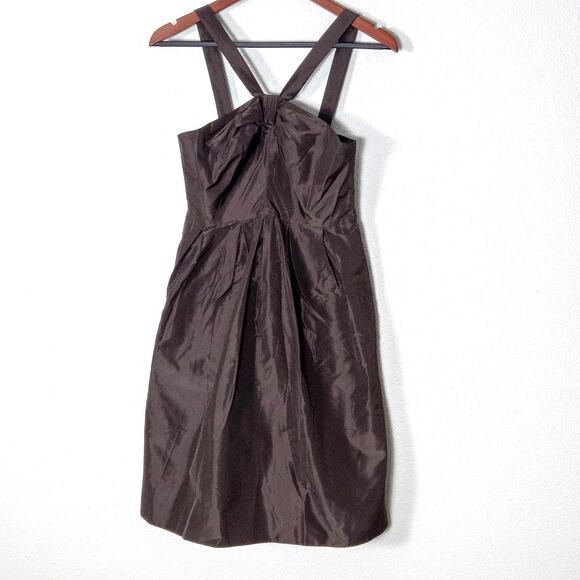 This J.Crew silk occasion dress delivers a clean minimalist vibe with its rich brown tone, structured bodice, and elegant pleated skirt. The crossover straps and subtle sheen elevate it into a refined piece perfect for weddings, dances, and evening events where understated polish stands out.