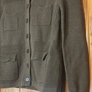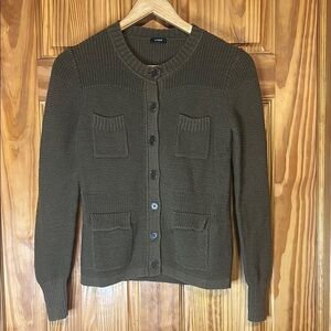 Stylish olive green knit cardigan by J.Crew. Features button-up front and pocket details. No size tag but it looks to be a small and measurements are in the pictures. Excellent condition.