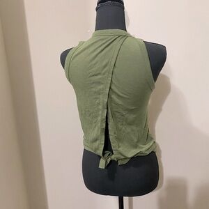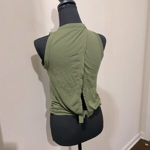 Olive green J.Crew tank top featuring a stylish split back with tie detail, perfect for workouts, casual days, or layering over a sports bra for an on-trend athleisure look.