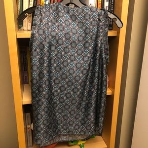 Lovely blouse with turquoise, white, purple pattern and ruffle in the front. Like new