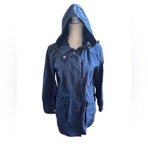Adjustable waist with drawcord and hood. Hidden zip closure with snaps.