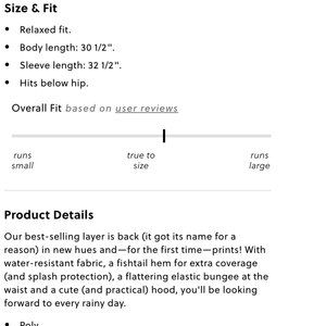 Our best-selling layer! With water-resistant fabric, a fishtail hem for extra coverage (and splash protection), a flattering elastic bungee at the waist and a cute (and practical) hood, you'll be looking forward to every rainy day.