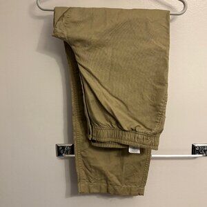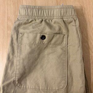J.Crew Pier pant in cotton-linen blend canvas. Size medium; color Khaki. **This pant has been altered to a 37" outseam**. Woven in a breathable 56% cotton/44% linen blend with a button-front elastic waist, an internal drawstring and a functional zip fly, these pull-on pants have a straight fit, and angled hand pockets for easy entry. Machine wash cold.