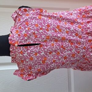 J.Crew Pink Orange Floral Ruffle Sleeve Cotton Comfy Pockets Tiered Midi Dress