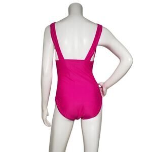 Beautiful J.Crew one-piece swimsuit in bold pink with a flattering V-neck, ruched body, low-cut leg, and high-rise back. Features removable padding, full coverage, and built-in UPF 50 sun protection. Perfect for beach days, resort trips, or chic summer looks. From a smoke-free home.