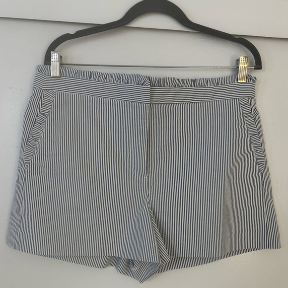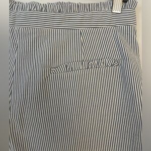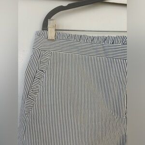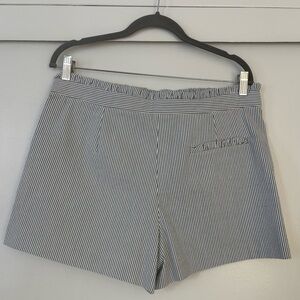The perfect summer short! Blue and white pinstripe short with beautiful ruffle detail around the waist and on the back pocket.