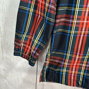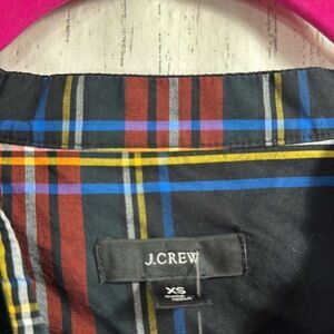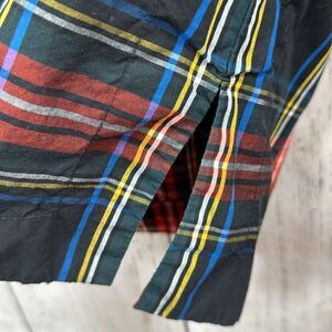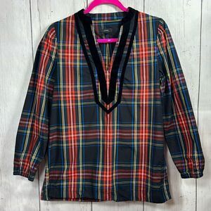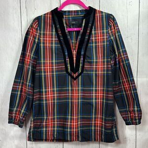 Beautiful J.Crew long sleeve plaid blouse featuring a rich navy, red, and gold tartan pattern with luxe black velvet trim at the neckline. Crafted from lightweight cotton with a relaxed fit — perfect for layering or styling for the holidays. Timeless preppy aesthetic with a touch of festive elegance.