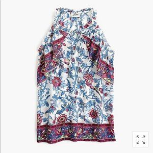 J.Crew Point Sur Sleeveless Ruffle Block Print Top. Off white with burgundy, blues and a touch of yellow. Floral print and birds. Ruffled trim and drapey shoulders. Breezy cotton lightweight cotton fabric