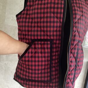 J.Crew Factory quilted gingham vest in red and black buffalo check. Sleeveless with full zip front, two front pockets, and black trim. Diamond quilted for warmth and structure. Size Medium. Excellent used condition with no flaws.