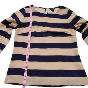 J.Crew Rayon Stripe Blouse Tan and navy Keyhole Button back 3/4 sleeves Size XS Smoke free Top rated Seller Fast shipping O1.80