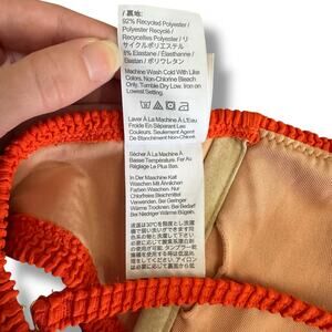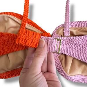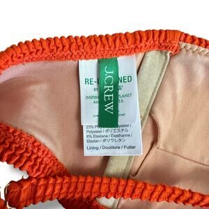 Upgrade your summer swimwear collection with this J.Crew Re-Imagined smocked bikini set — a bold, sustainable style made from recycled materials. Featuring a two-tone bandeau bikini top in lilac purple and bright orange with smocked texture, cut-out ring detail, adjustable/removable straps, and hook back closure, paired with matching smocked orange bikini bottoms.