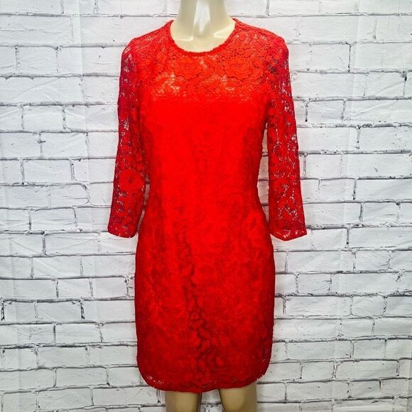 J. Crew Red/Orange 3/4 Sleeve Poppy Coral Floral Lace Sheath Dress Size 6