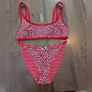 Stylish bikini set reversible with a red and white pattern. Features a unique design with stripes and dots and strawberries on the other XL sz