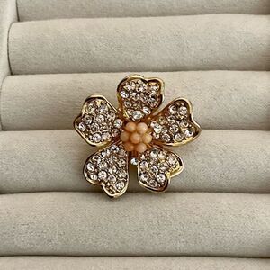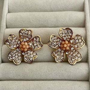 EUC - Sparkling Rhinestone Flower Earrings with Pave Rhinestones and Peach Cabochon Stones. Set in Gold Tone Metal. Fun Statement Earrings for Evening or Special Occasions!