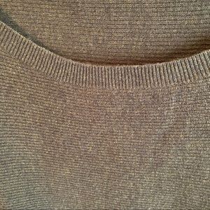 Pretty fatigue green (see last photo for more accurate color) ribbed tunic sweater with dolman sleeve. Light pilling. 40% wool, 35% nylon, 25% viscose. Dry clean.